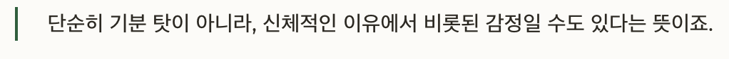 단순히 기분 탓이 아니라, 신체적인 이유에서 비롯된 감정일 수도 있다는 뜻이죠.