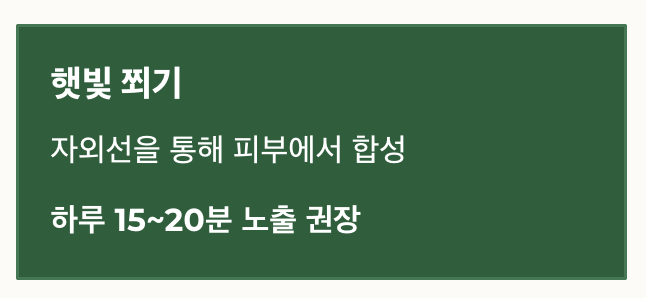 햇빛 쬐기 자외선 통해 피부에서 합성, 하루 15~20분 노출 권장