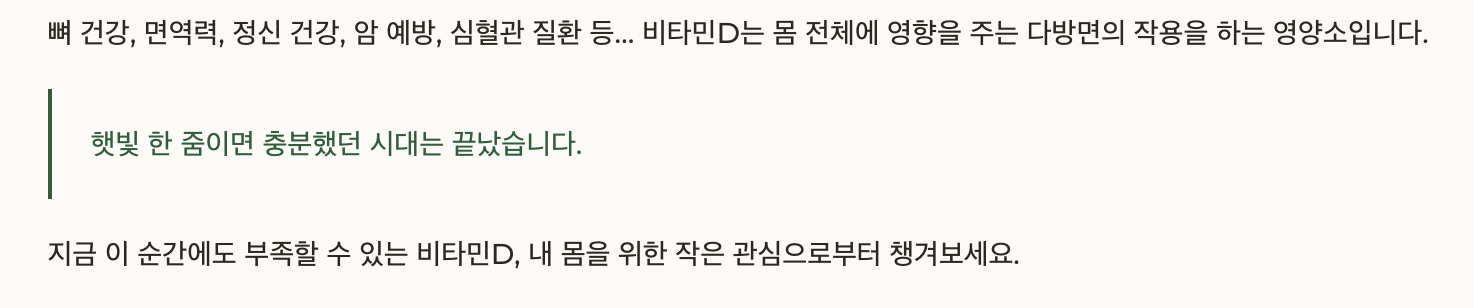 지금 이 순간에도 부족할 수 있는 비타민D, 내 몸을 위한 작은 관심으로부터 챙겨보세요.