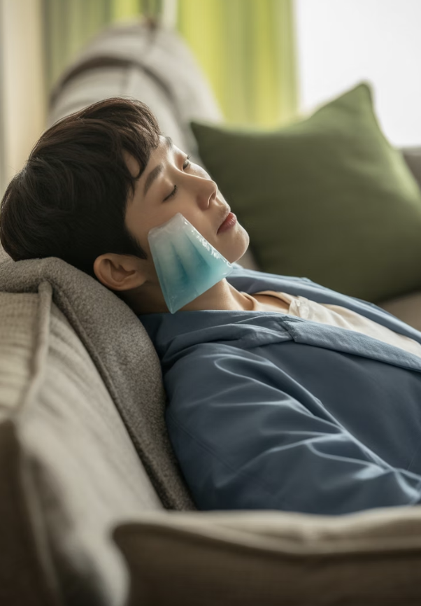 10분 찜질 후 10분 쉬는 식으로 반복하면 효과적입니다. - 식사: 마취가 풀린 후, 차갑고 부드러운 음식(예: 죽, 요구르트)을 먹되,