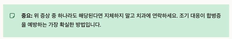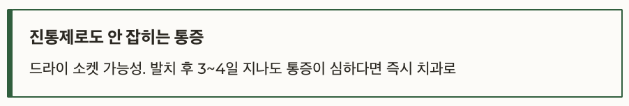 | 진통제로도 안 잡히는 통증 | 드라이 소켓 가능성. 발치 후 3~4일 지나도 통증이 심하다면 즉시 치과로 |