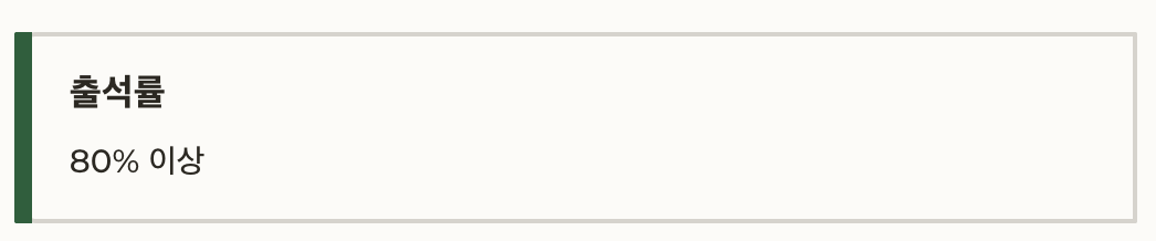 출석률 80%, 평균 성적 60점 이상만 맞추면 무리 없이 과목을 이수할 수 있어요.