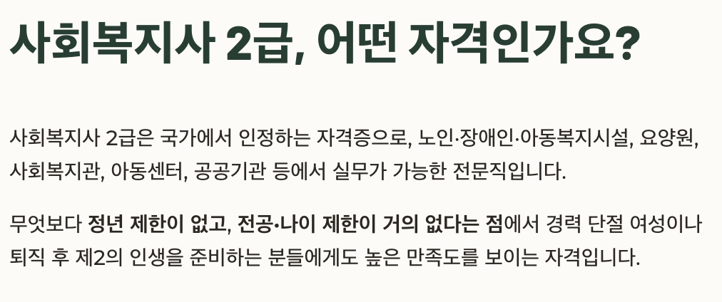 아이들이 어느 정도 자라고 나서 다시 일할 수 있는 길을 찾던 중, 시간과 비용 부담을 줄이면서도 미래 안정성까지 챙길 수 있는 자격증으로 사회복지사 2급이 매력적으로 다가왔다는 분들이 많습니다.