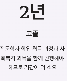 고졸의 경우 전문학사 학위 취득 과정과 사회복지 과목을 함께 진행해야 하기 때문에 기간이 조금 더 걸릴 수 있습니다.