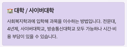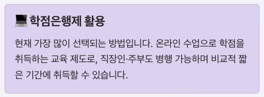 특히 학점은행제를 활용하면 직장인이나 주부도 온라인 수업을 통해 준비할 수 있는 장점이 있습니다.