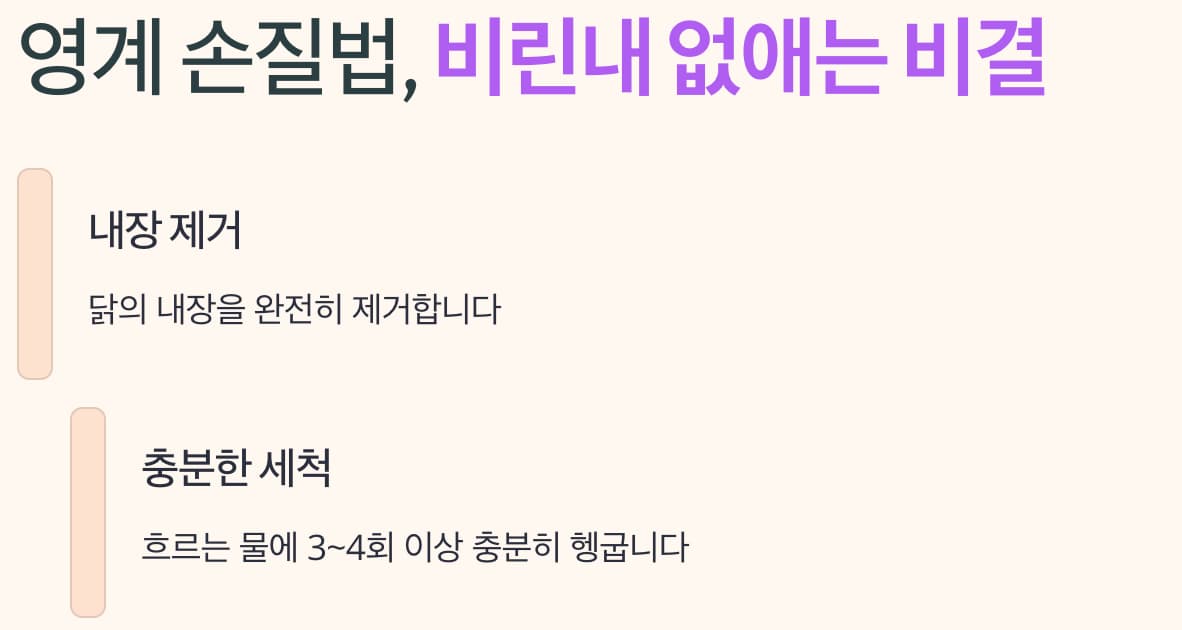 닭은 내장을 제거하고 흐르는 물에 3~4회 이상 충분히 헹궈야 합니다.