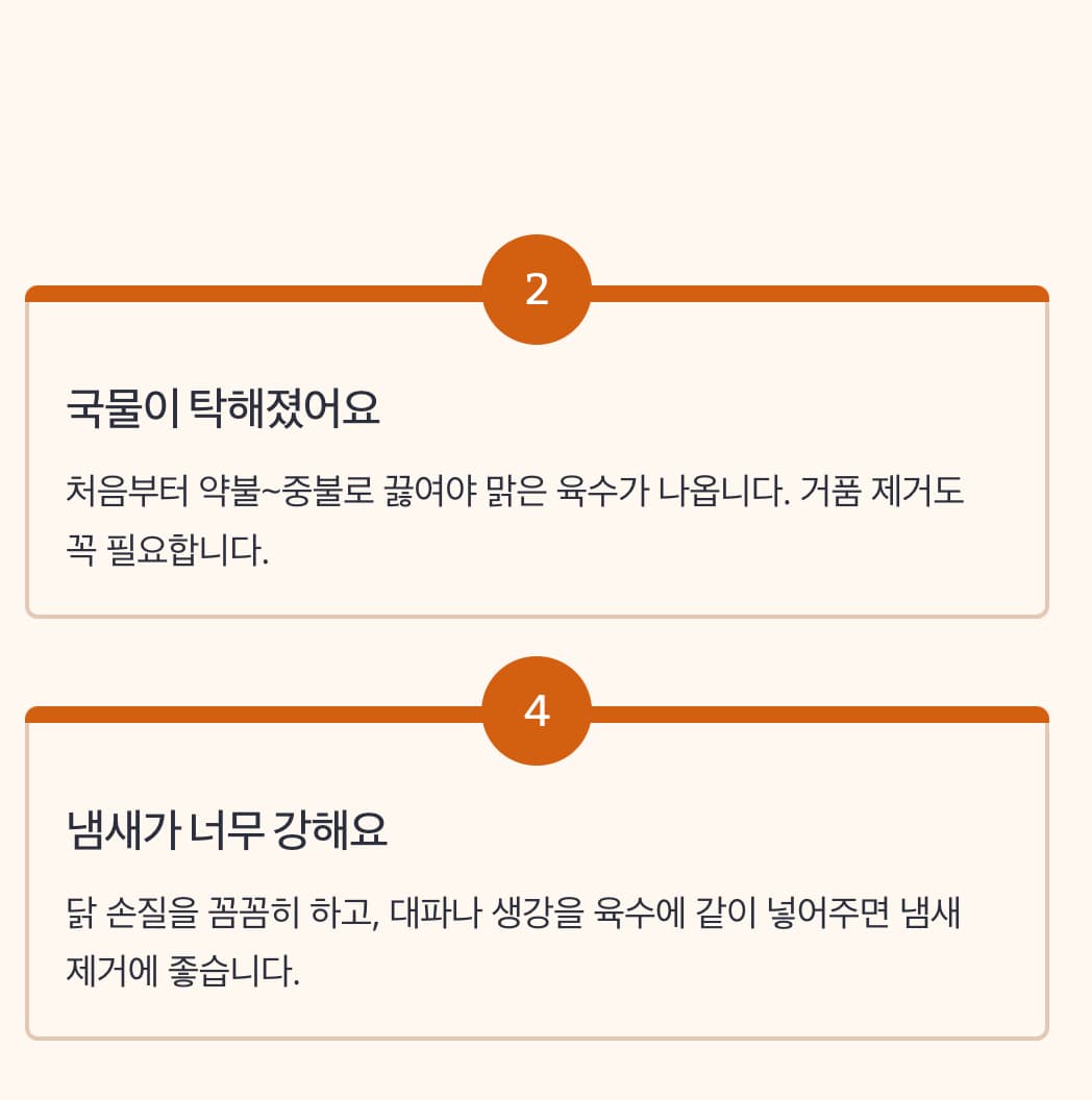 냄새가 너무 강해요 닭 손질을 꼼꼼히 하고, 대파나 생강을 육수에 같이 넣어주면 냄새 제거에 좋습니다.