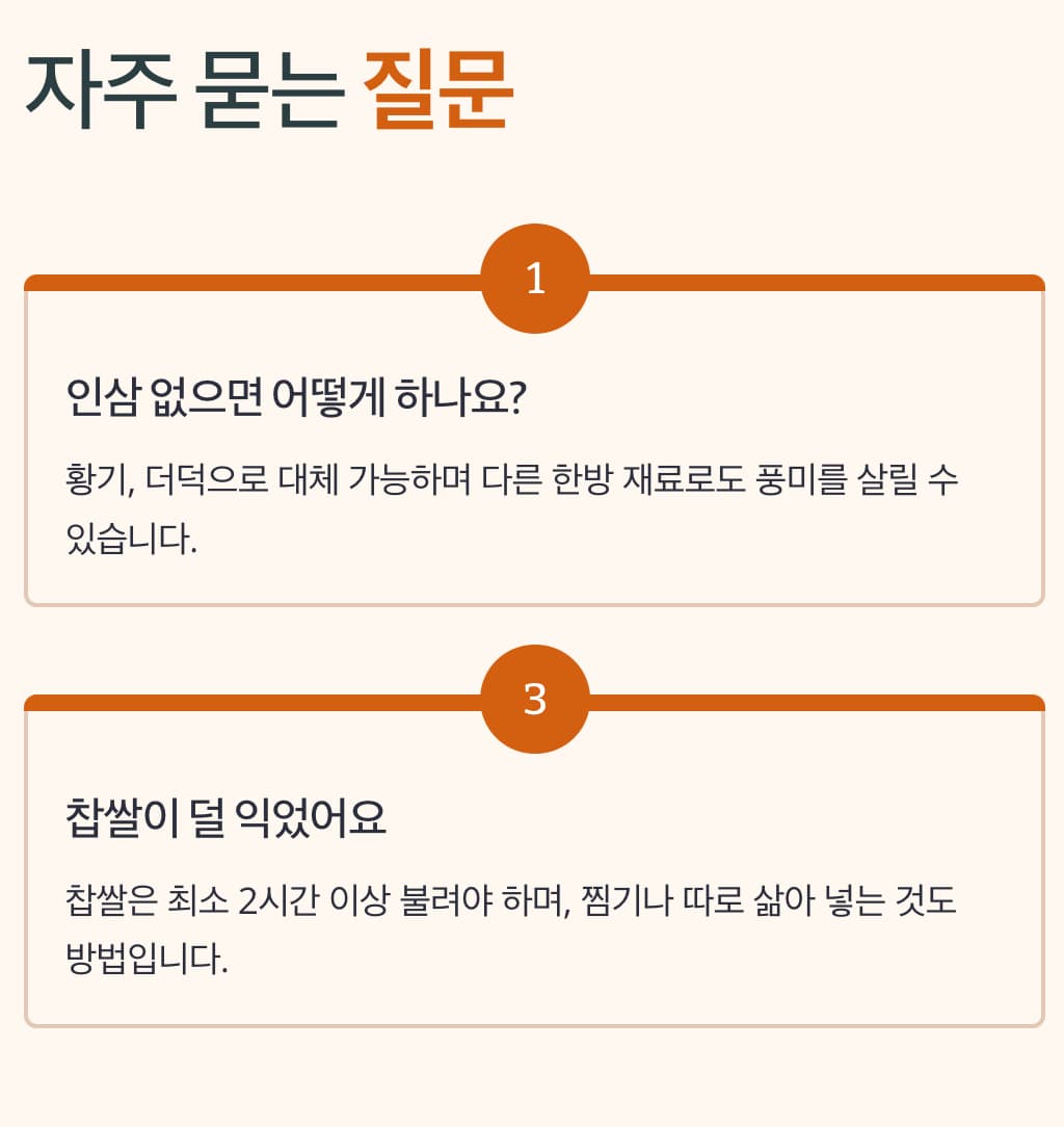 인삼 없으면 어떻게 하나요? 황기, 더덕으로 대체 가능하며 다른 한방 재료로도 풍미를 살릴 수 있습니다.