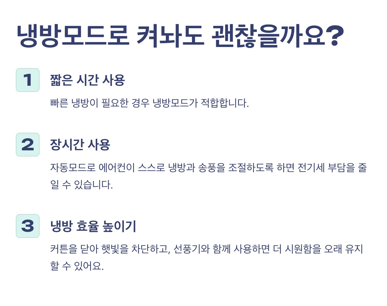 짧은 시간 시원함이 필요하다면 냉방모드 사용이 적합합니다.