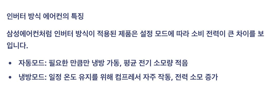 | 냉방모드 | 설정 온도 유지 위해 지속 가동, 전력 소모 증가 가능 |