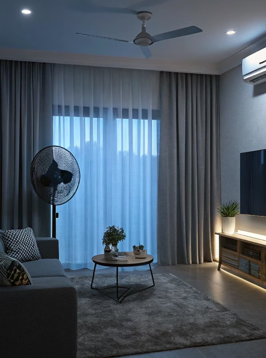 냉방 효율을 높이기 위해 커튼을 닫아 햇빛을 차단하고,