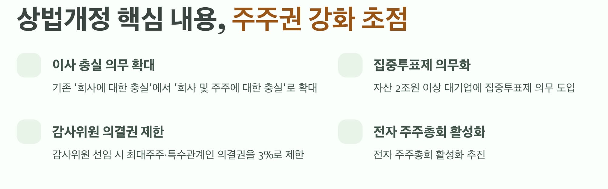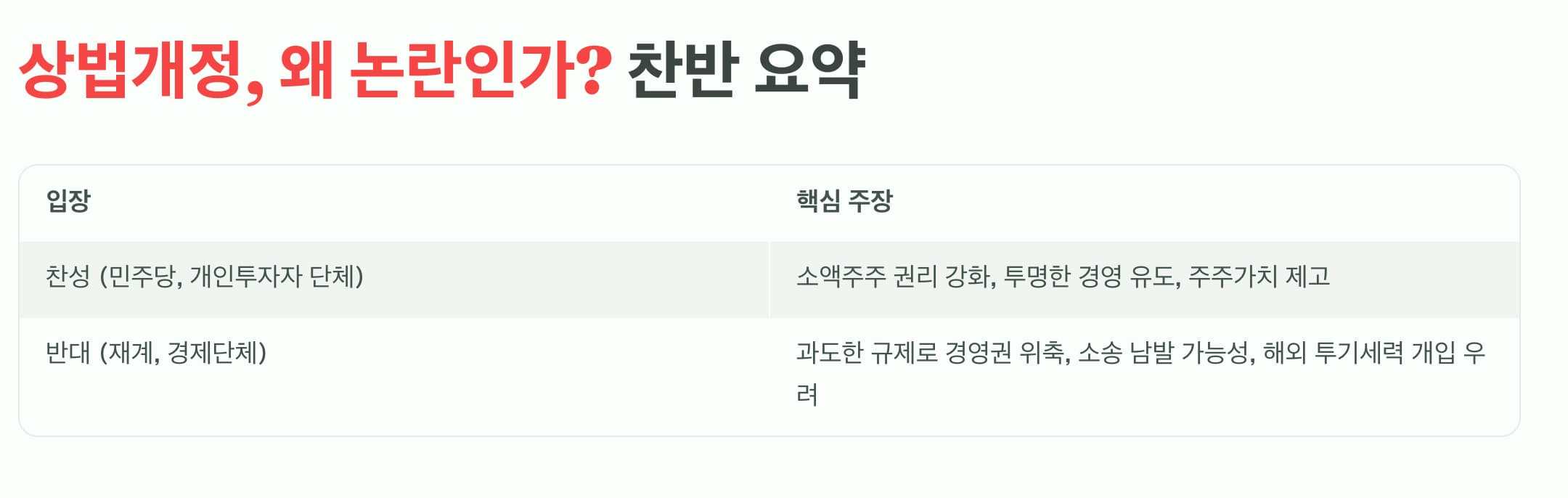 | 찬성 (민주당, 개인투자자 단체) | 소액주주 권리 강화, 투명한 경영 유도, 주주가치 제고 |