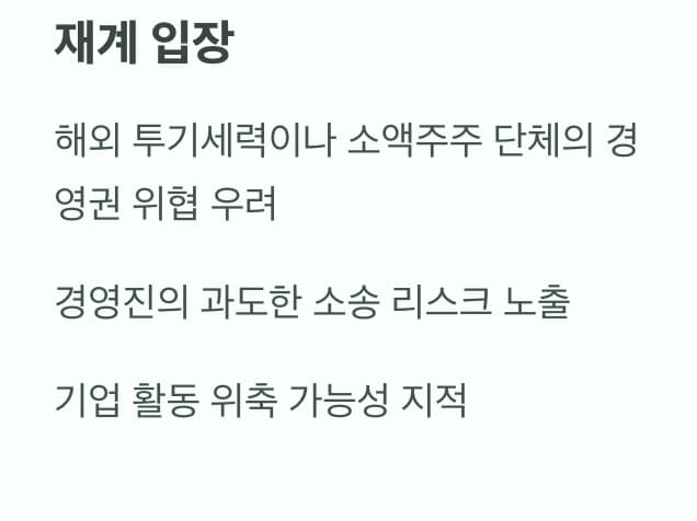 | 반대 (재계, 경제단체) | 과도한 규제로 경영권 위축, 소송 남발 가능성, 해외 투기세력 개입 우려 |
