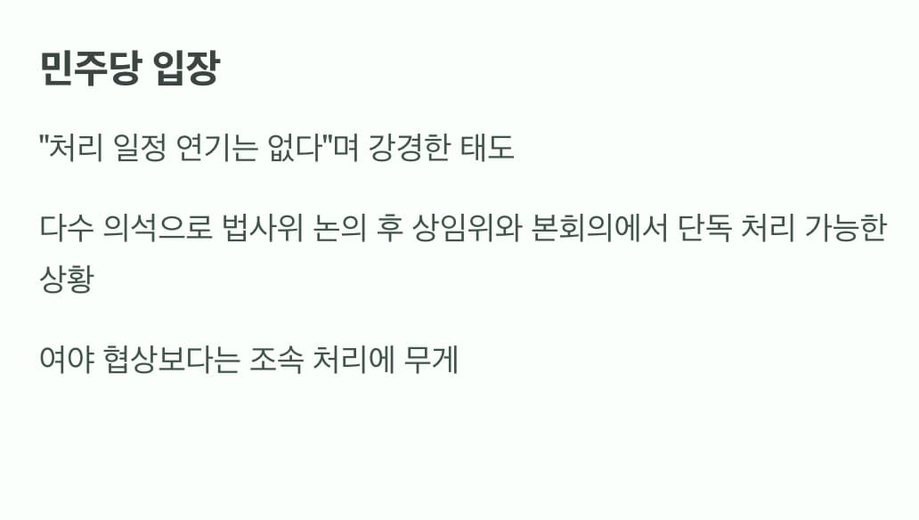 민주당은 다수 의석으로 법사위 논의 후 상임위와 본회의에서