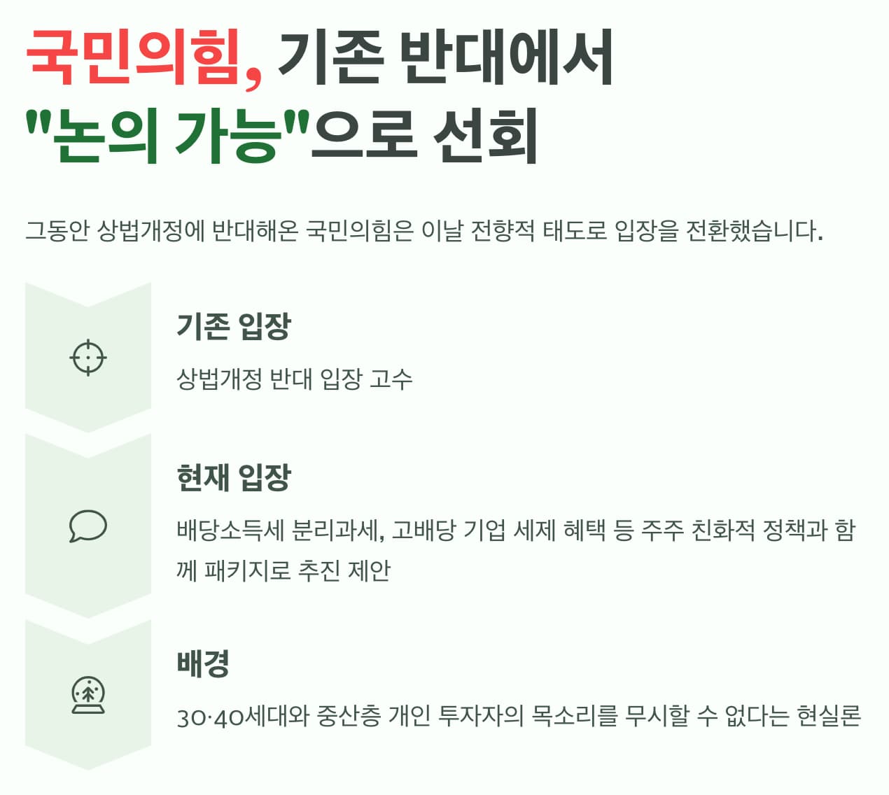 | 찬성 (민주당, 개인투자자 단체) | 소액주주 권리 강화, 투명한 경영 유도, 주주가치 제고 |