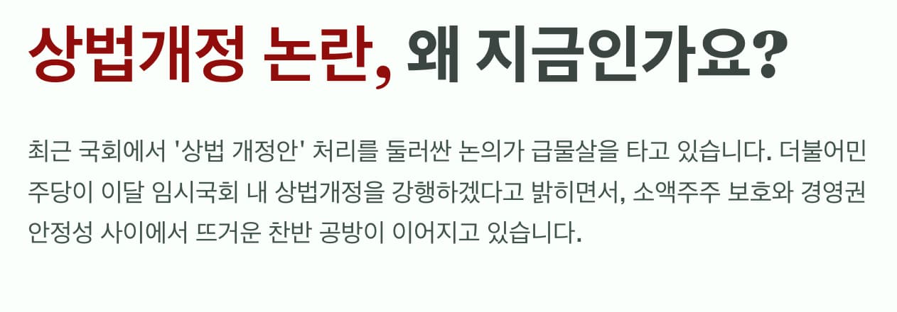 최근 국회에서 ‘상법 개정안’ 처리를 둘러싼 논의가 급물살을 타고 있습니다.