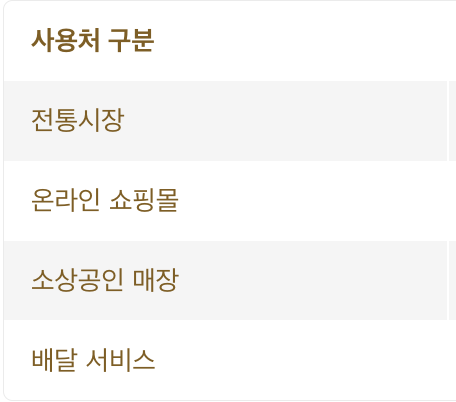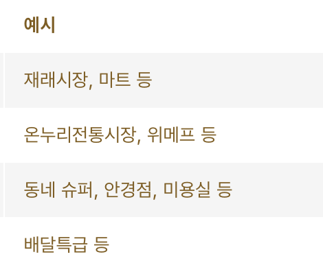 | 소상공인 매장 | 동네 슈퍼, 안경점, 미용실 등 | 소상공인 확인 필요 |