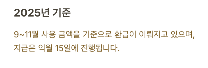 특히 2025년에는 9~11월 사용 금액을 기준으로 환급이 이뤄지고 있으며, 지급은 익월 15일에 진행됩니다.