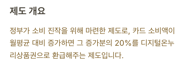 정부가 소비 진작을 위해 마련한 제도로, 카드 소비액이 월평균 대비 증가하면 그 증가분의 20%를 디지털온누리상품권으로 환급해 주는 제도입니다.