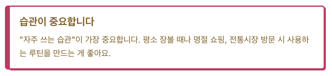 그래서 "자주 쓰는 습관"이 가장 중요합니다. 평소 장 볼 때나 명절 쇼핑, 전통시장 방문 시 사용하는 루틴을 만드는 게 좋아요.