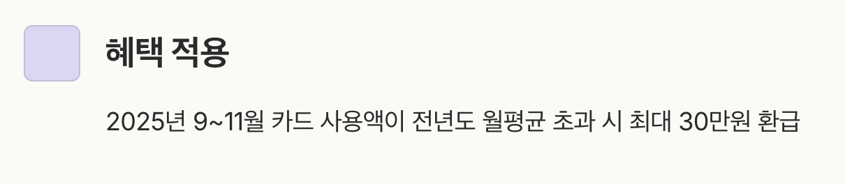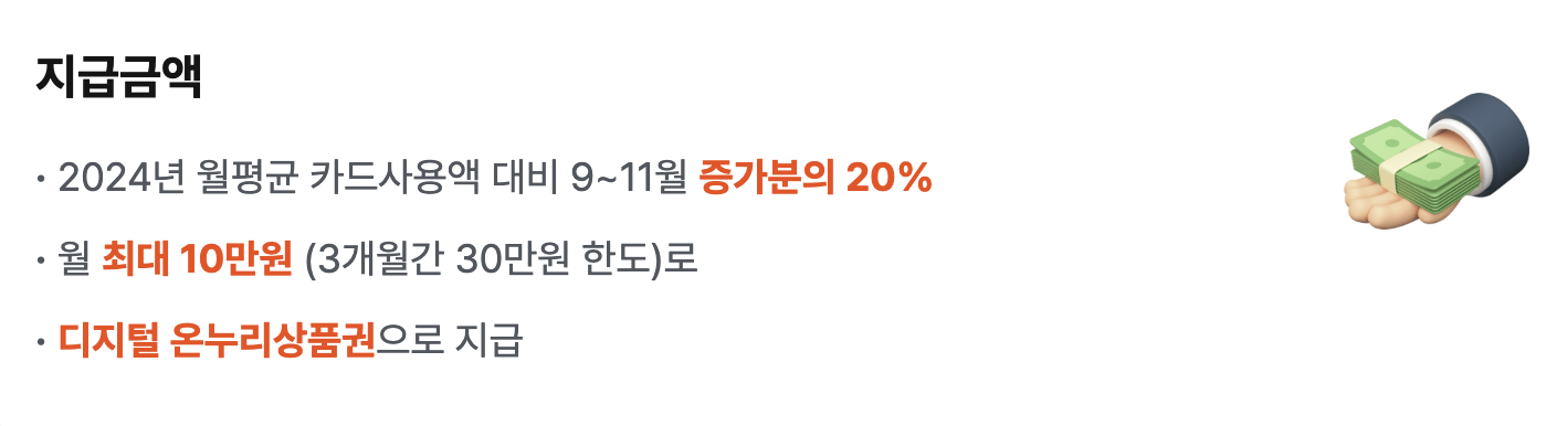 단, 2025년 9월부터 11월까지의 카드 사용액이 전년도 월평균보다 많아야 혜택이 적용됩니다.