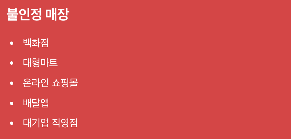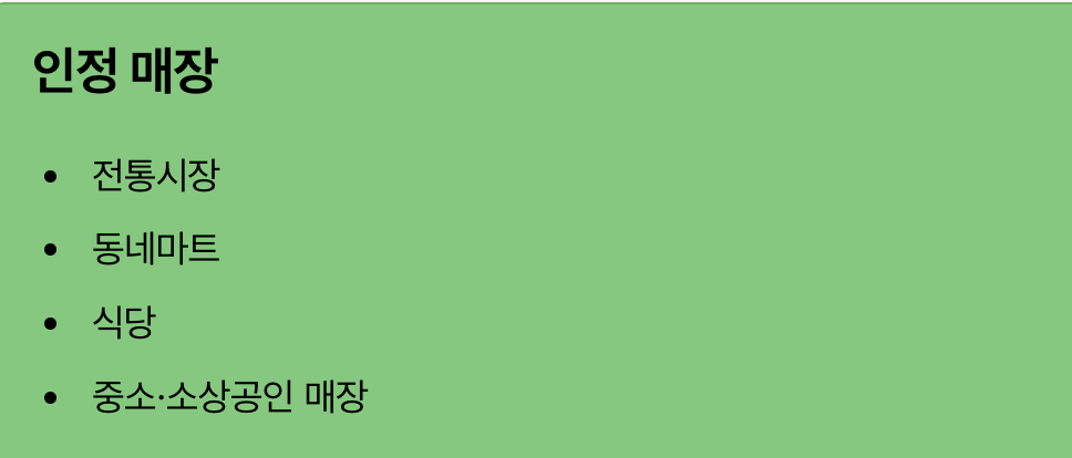 그러나 백화점, 대형마트, 온라인 쇼핑몰, 배달앱, 대기업 직영점에서는 사용액이 인정되지 않습니다.