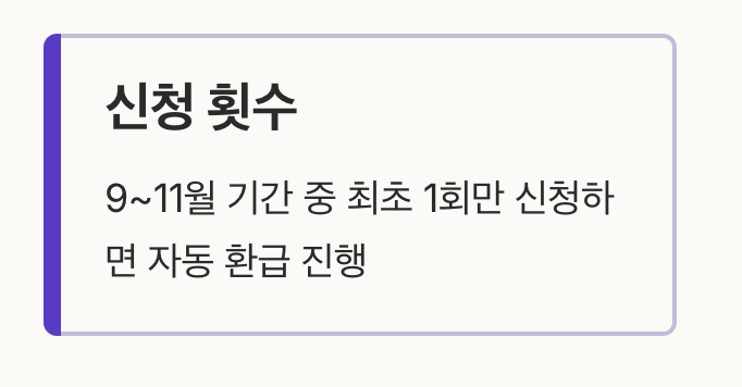 또한 9~11월 기간 동안 최초 1회만 신청하면 자동으로 환급이 진행되므로 매달 따로 신청할 필요가 없습니다.