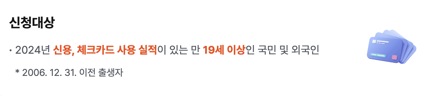 2024년 카드 사용 이력이 있는 만 19세 이상 국민과 국내 거주 외국인이라면 누구나 신청할 수 있습니다.
