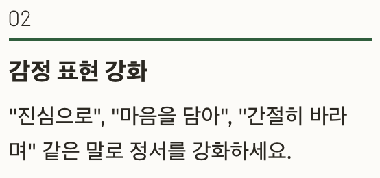 | 감정 표현 | "진심으로", "마음을 담아", "간절히 바라며" 같은 말로 정서 강화 |
