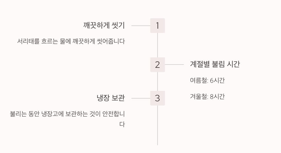 너무 오래 불리면 단백질 손실이 생길 수 있으니 주의하세요.