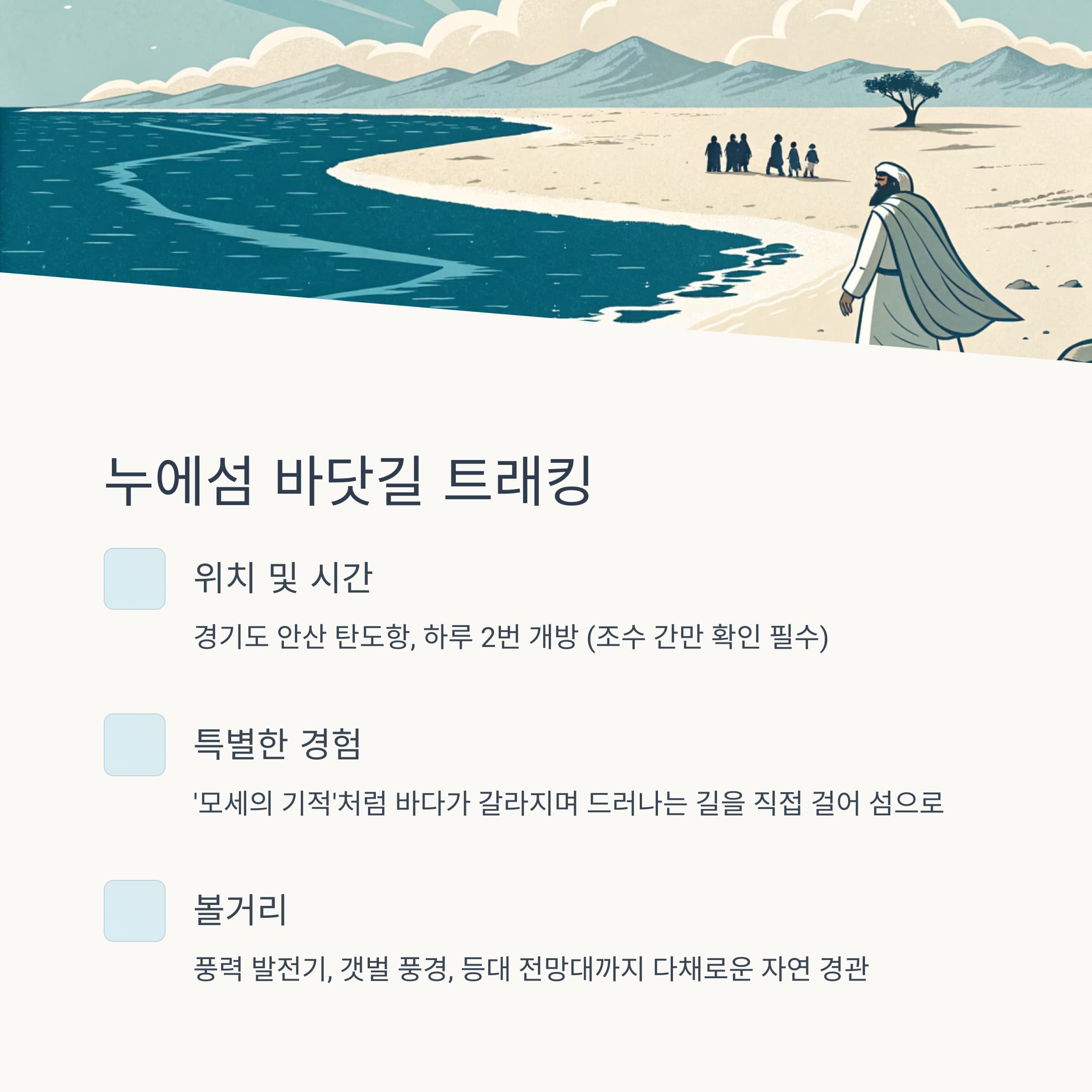 - 개방 시간: 하루 2번 (조수 간만 시간 확인 필수)