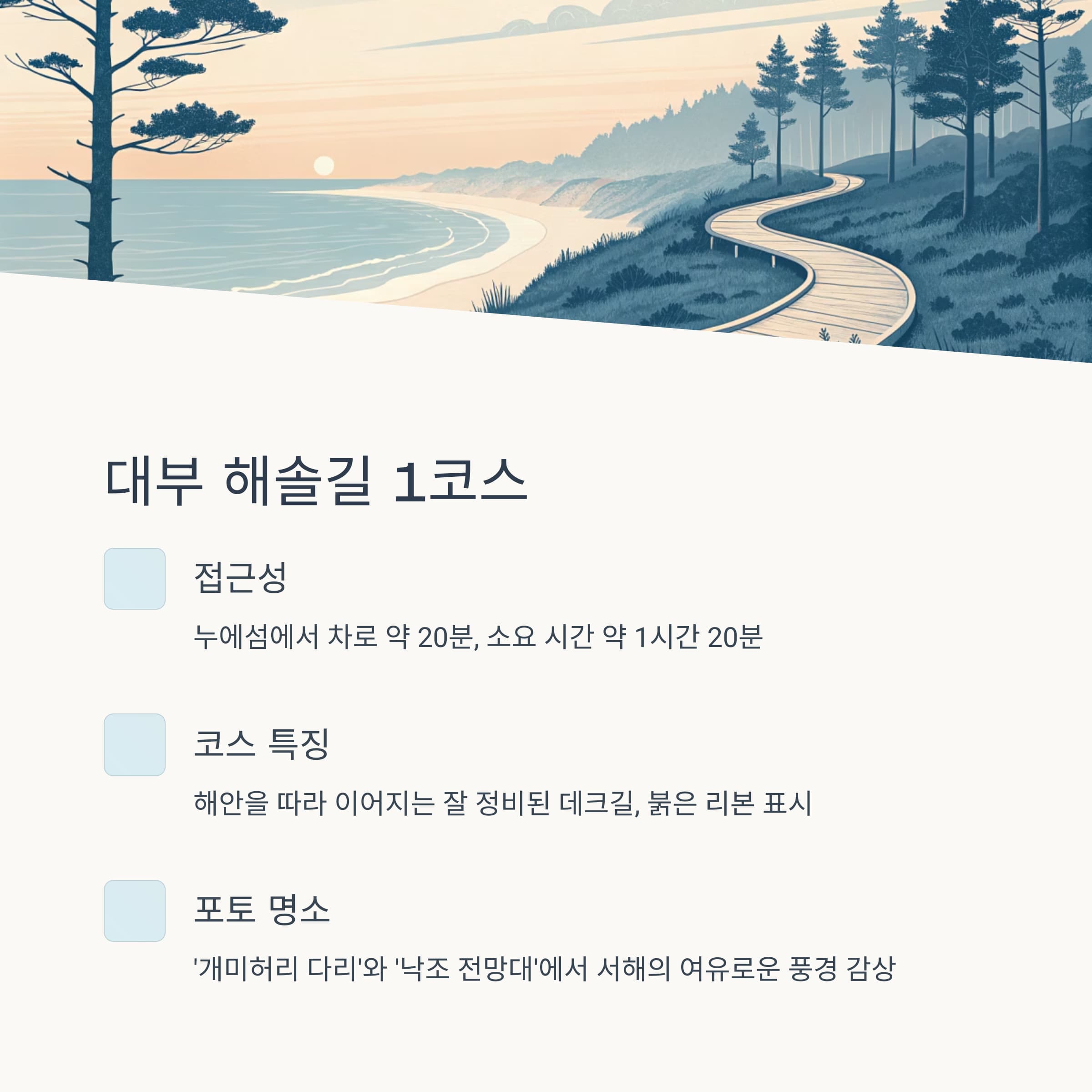- 코스 특징: 해송숲, 해안선, 전망대가 어우러진 감성 산책로