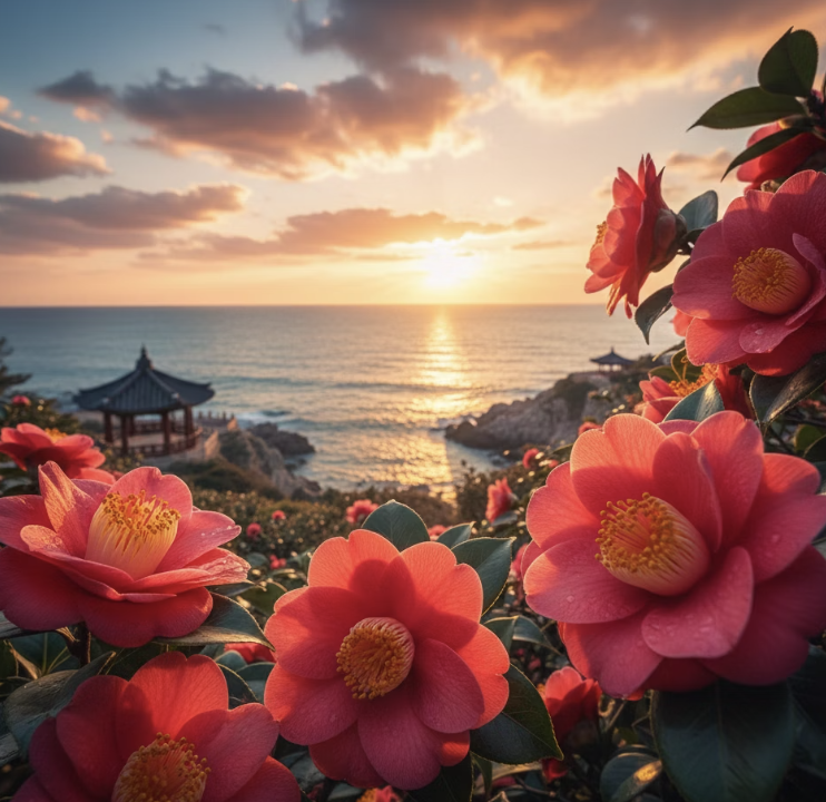 붉은 동백꽃이 바다와 어우러져 사진 명소로도 유명합니다.