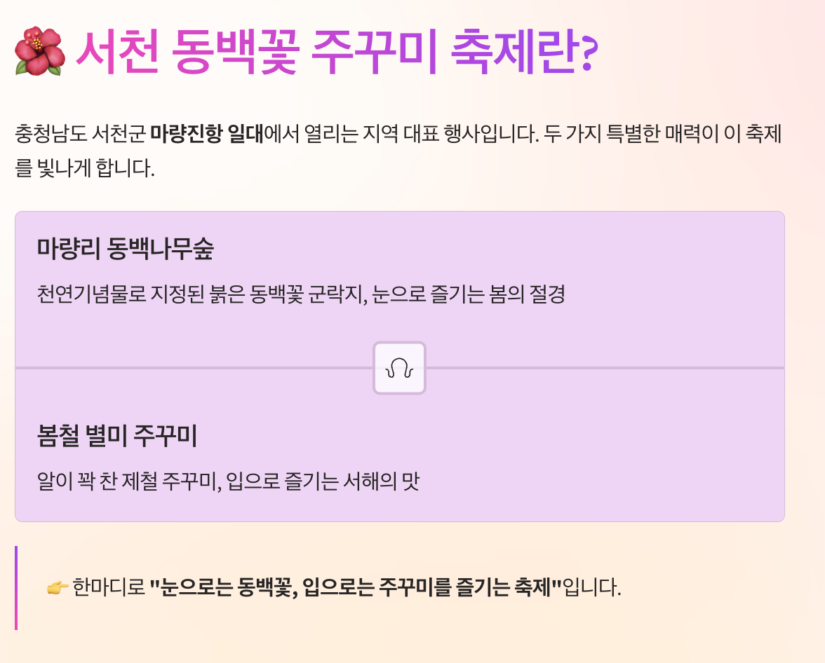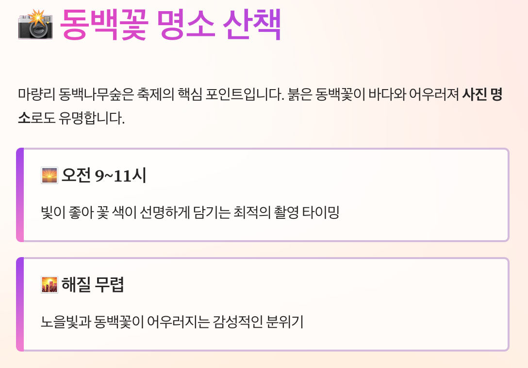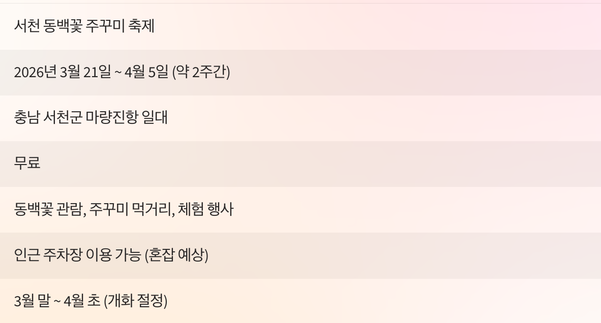 | 주요 콘텐츠 | 동백꽃 관람, 주꾸미 먹거리, 체험 행사 |