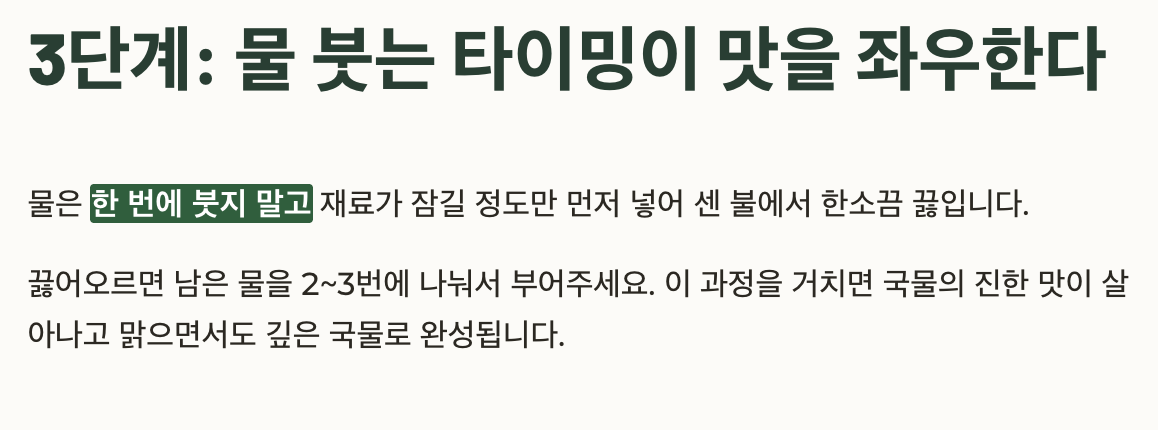 | 국물 진하게 끓이기 | 물은 2~3번에 나눠서 붓기 |