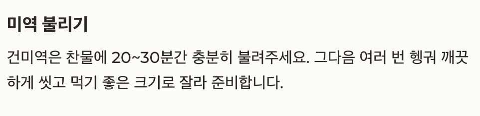 | 주재료 | 건미역 20~30g, 소고기 국거리 200~300g (양지 추천) |
