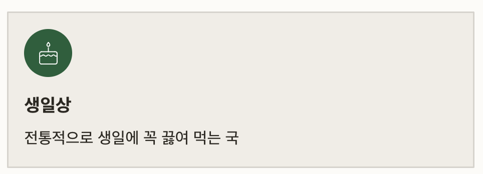 | 생일상 | 전통적으로 생일에 꼭 끓여 먹는 국 |