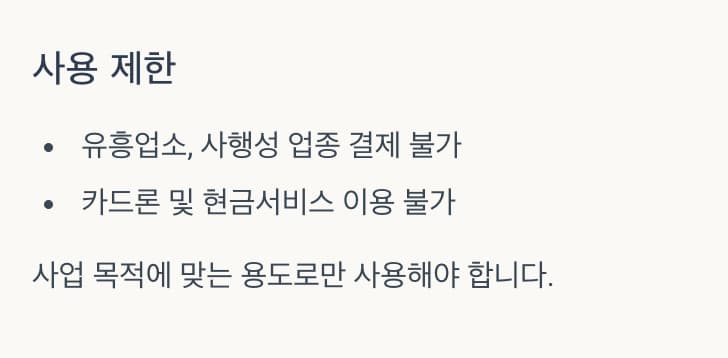 다만 유흥업소, 사행성 업종 결제는 제한되며