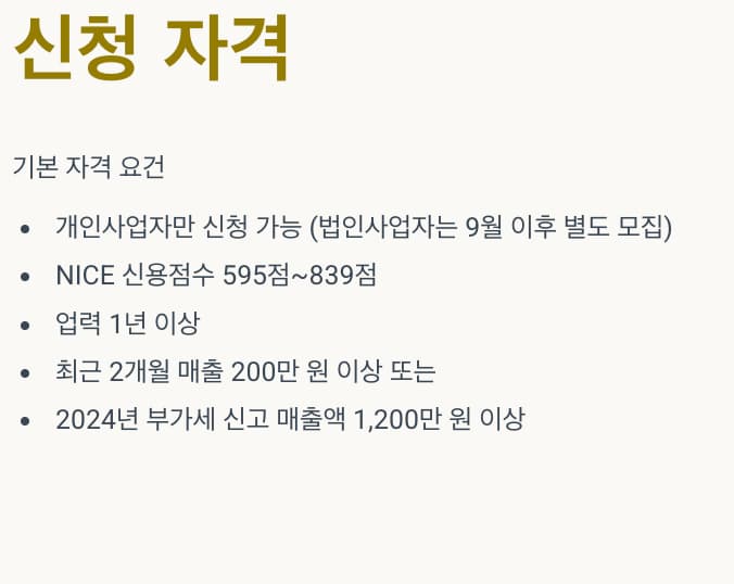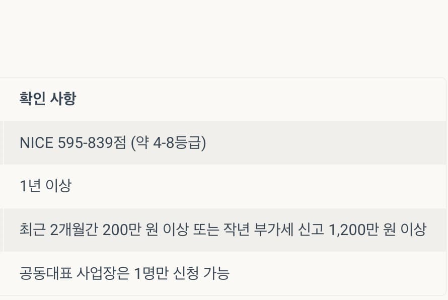 기본 자격은 NICE 신용점수 595점부터 839점 구간, 업력 1년 이상,