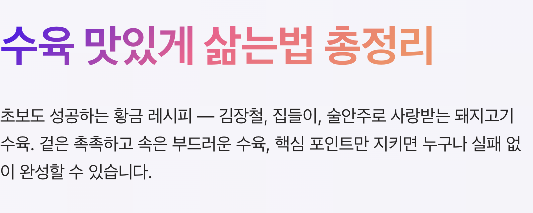 | 기본 수육 | 된장, 마늘, 대파, 양파 | 담백하고 깔끔한 맛 | 김장, 일상 반찬 |
