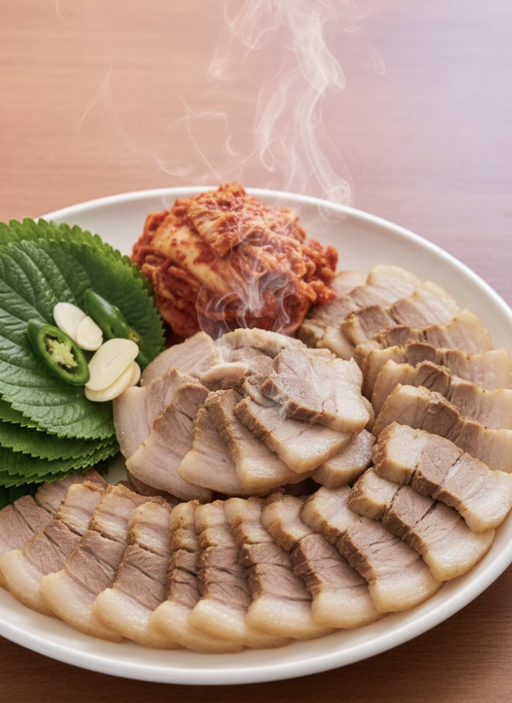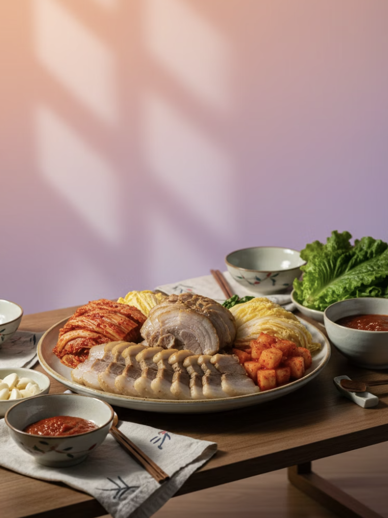 김장 김치나 겉절이와 함께 먹으면 가장 기본이면서도 최고의 조합입니다. 여기에 쌈장, 새우젓, 마늘, 쌈채소를 곁들이면 한층 더 풍성한 식사를 즐길 수 있습니다.