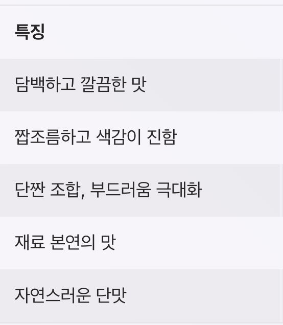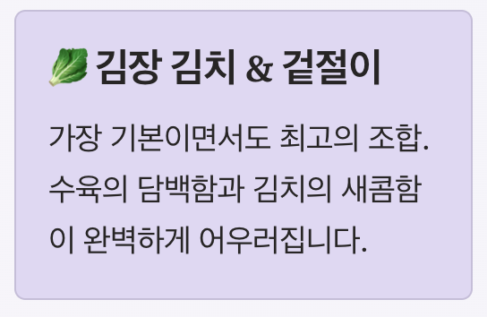 | 간장 수육 | 간장, 설탕, 마늘 | 짭조름하고 색감이 진함 | 술안주, 손님상 |