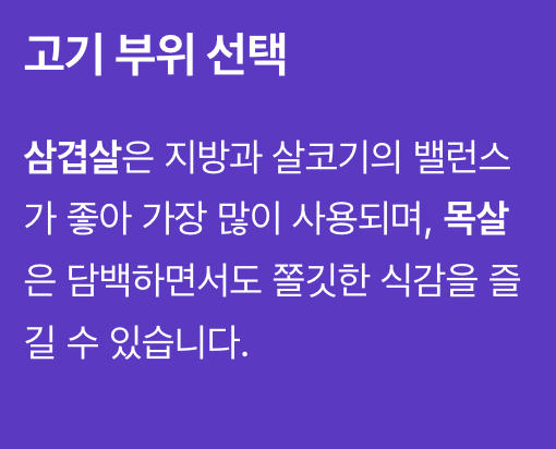 먼저 가장 중요한 것은 고기 부위입니다. 삼겹살은 지방과 살코기의 밸런스가 좋아 가장 많이 사용되며, 목살은 담백하면서도 쫄깃한 식감을 즐길 수 있습니다.