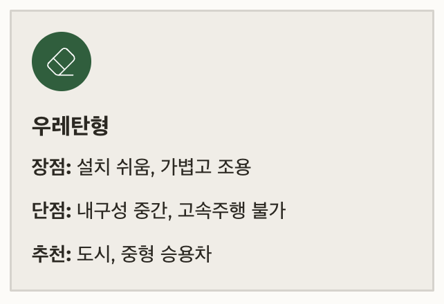 | 우레탄형 | 설치 쉬움, 가볍고 조용 | 내구성 중간, 고속주행 불가 | 도시, 중형 승용차 |