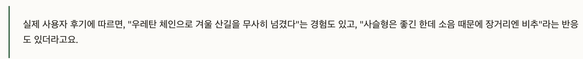 “사슬형은 좋긴 한데 소음 때문에 장거리엔 비추”라는 반응도 있더라고요.
