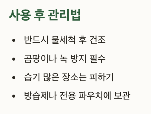 보관할 땐 습기 많은 장소는 피하시고, 방습제나 전용 파우치에 넣으면 오래 쓸 수 있답니다.