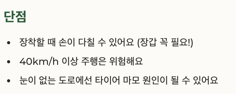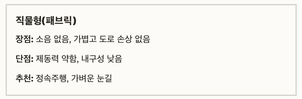 | 직물형(패브릭) | 소음 없음, 가볍고 도로 손상 없음 | 제동력 약함, 내구성 낮음 | 정속주행, 가벼운 눈길 |