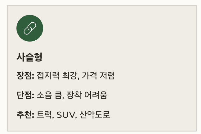| 사슬형 | 접지력 최강, 가격 저렴 | 소음 큼, 장착 어려움 | 트럭, SUV, 산악도로 |