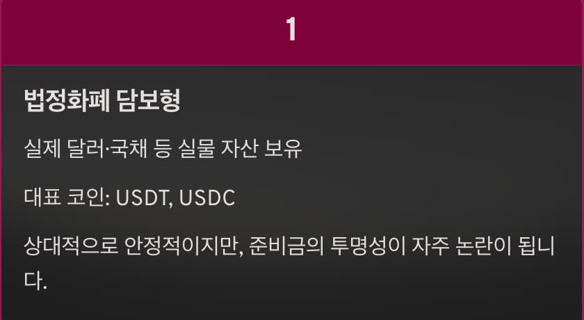 법정화폐 담보형은 상대적으로 안정적이지만, 준비금의 투명성이 자주 논란이 됩니다.