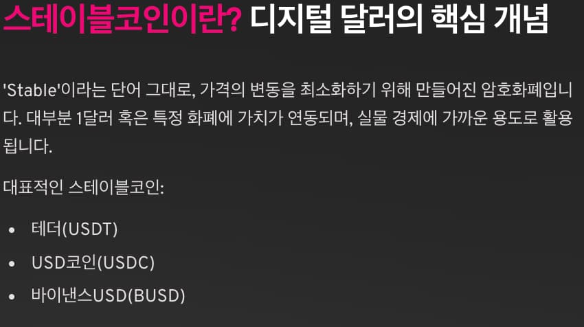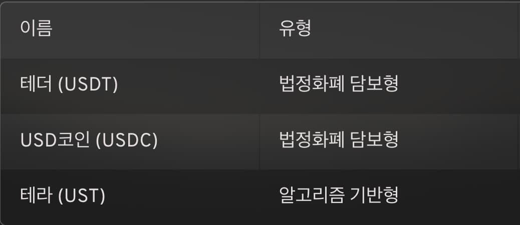 테더(USDT), USD코인(USDC), 바이낸스 USD(BUSD) 등이 있으며,